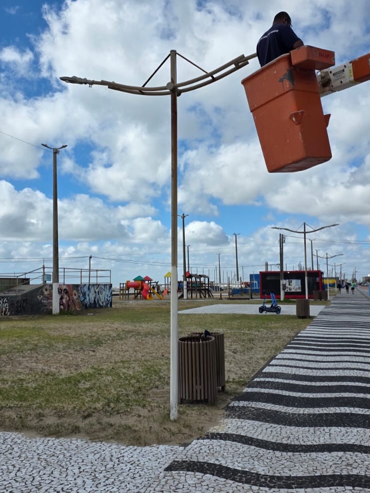 Reposição de lâmpadas e conserto de luminárias ao longo da Avenida Beira-Mar.